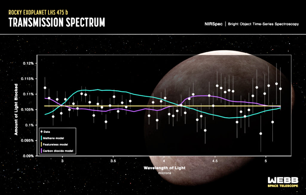 “These first observational results from an Earth-size, rocky planet open the door to many future possibilities for studying rocky planet atmospheres with Webb,” said Mark Clampin, Astrophysics Division director at NASA Headquarters in Washington. “Webb is bringing us closer and closer to a new understanding of Earth-like worlds outside our solar system, and the mission is only just getting started.” Graphic titled “Rocky Exoplanet LHS 475 b Atmosphere Composition, NIRSpec Bright Object Time-Series Spectroscopy.”