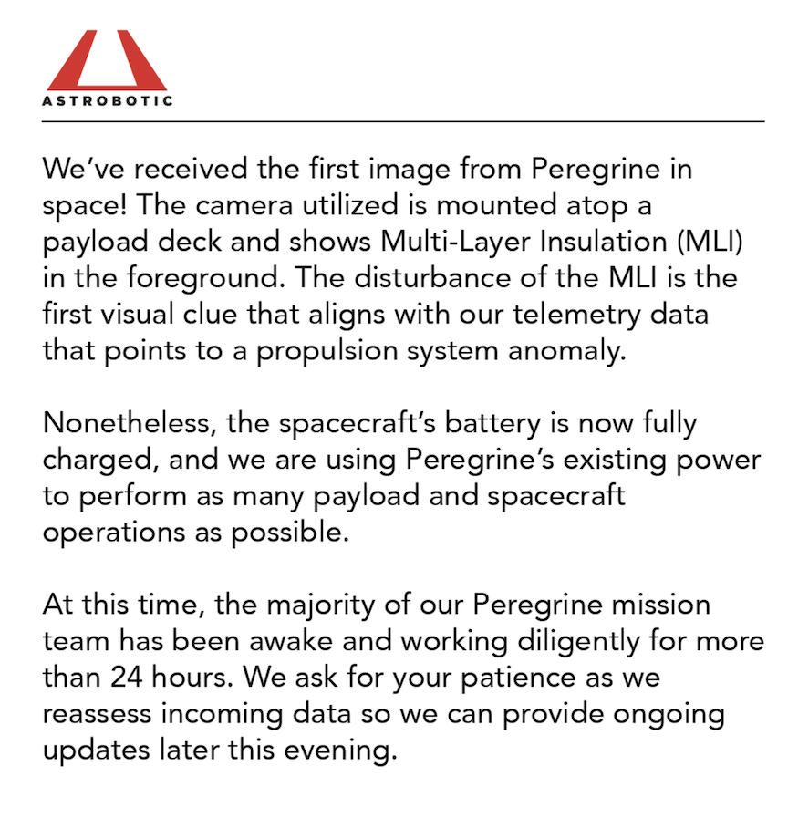 However, a few hours after launching the Peregrine spacecraft suffered a “critical” propellant leak that meant Astrobotic had little hope of becoming the first commercial company to achieve a soft landing on the moon.