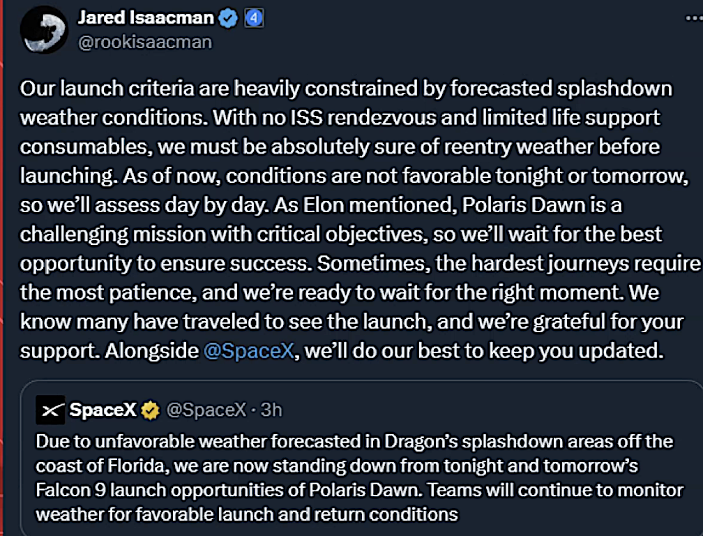 Weather still remains the reason for the SpaceX Poaris Dawn delay. Late yesterday this announcement was provided.
