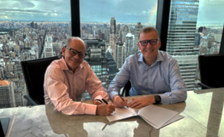 Chris Moore signing the agreement for Gogo to acquire Satcom Direct