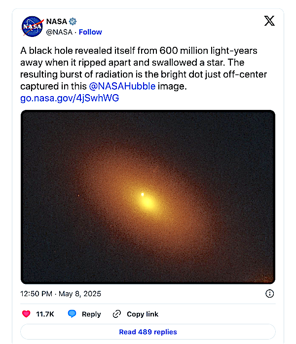 Posting the image to X, NASA wrote, “A black hole revealed itself from 600 million light-years away when it ripped apart and swallowed a star. The resulting burst of radiation is the bright dot just off-centre captured in this @NASAHubble image.”