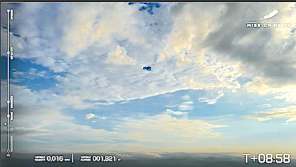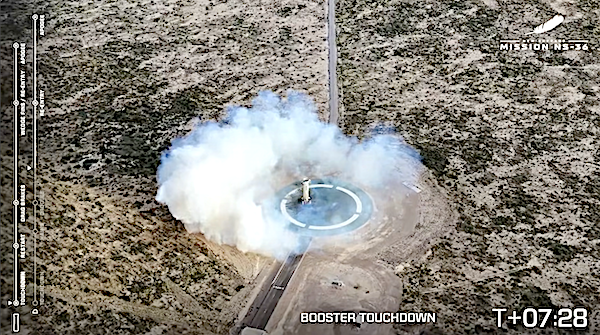 New Shepard’s first stage came back to Earth landing vertically about eight minutes after launch, and the autonomous vehicle’s capsule followed after several minutes carried under parachutes in the Texas desert.