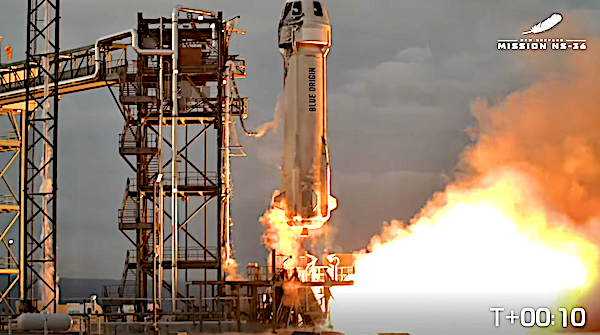 Blue Origin’s New Shepard vehicle lifted off from their West Texas launch site today at 9:40 a.m. EDT (1340 GMT; 8:40 a.m. local Texas time), launching this suborbital flight known as NS-36. Photos captured by Satnews.