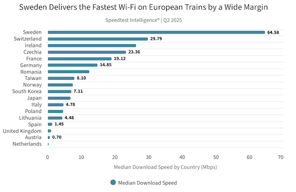 - The gap separating Europe’s best and worst is startling. In Q2 2025, Sweden set the pace for train Wi-Fi in Europe with a 64.58 Mbps median download, followed by Switzerland (29.79 Mbps) and Ireland (26.33 Mbps). Laggards like Spain (1.45 Mbps), the UK (1.09 Mbps) and the Netherlands (0.41 Mbps) featured the poorest outcomes, with download speeds as much as 158 times slower than top-performing Sweden.