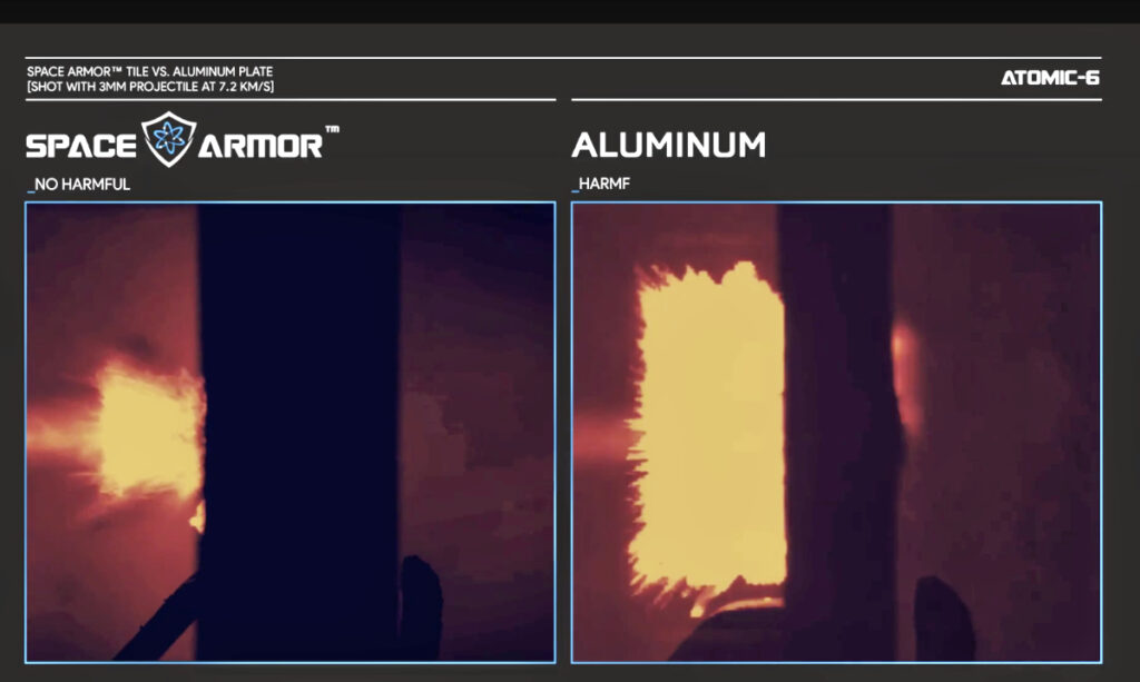 Atomic-6 Space Armor™ tiles are lighter and thinner than traditional Whipple shields, easy to install, and mitigates the creation of harmful debris. As seen in this side-by-side demonstration against aluminum, Space Armor™ tiles successfully stop a >7km/s projectile, producing virtually no byproducts. The aluminum equivalent shield, on the other hand, creates fragments larger than the initial projectile, and spalling debris behind the point of impact, which could damage the system it’s meant to protect.